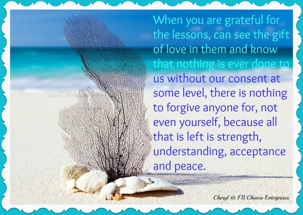 Mena’s poster was a life changer for me because it is so very true that when we can see the lessons and gifts, can feel gratitude for all we have experienced and do experience, the good, the bad and the ugly, we gain acceptance and peace and we learn that truly there is nothing to forgive ourselves or anyone else for when you know with every cell of your being that you are NOT a victim, that you chose at some part of you to experience what you did and do experience for your own growth and learning.